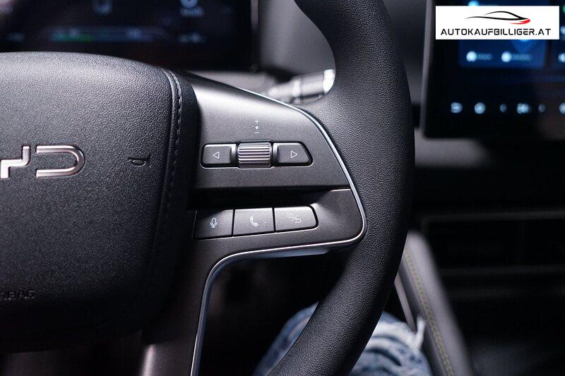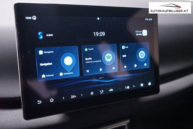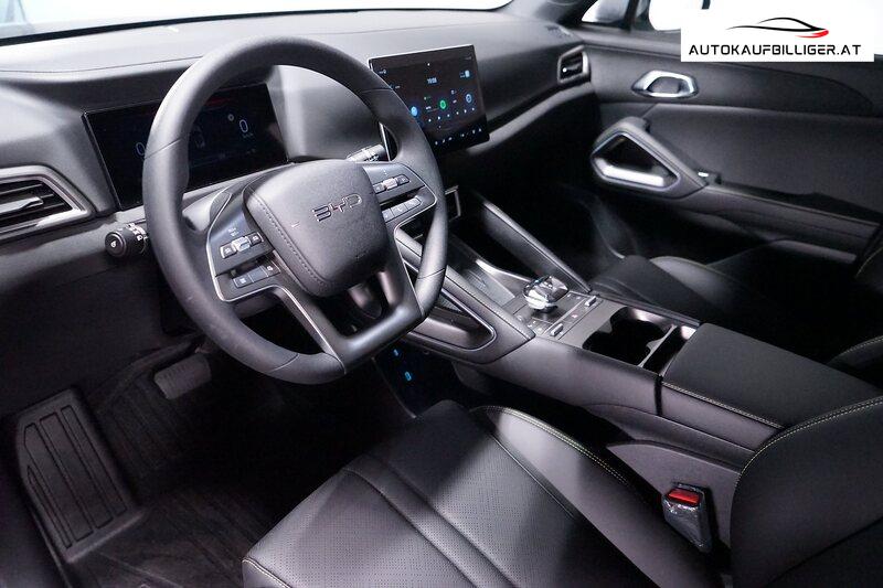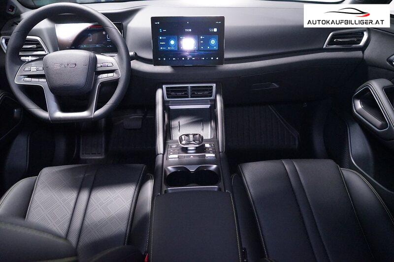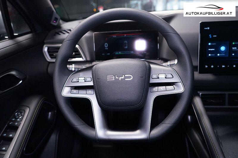 Ausstattung:Exterieur:Metallic-LackierungLED Scheinwerfer,Tagfahrlicht und HeckleuchtenFollow Me Home-Funktion (Scheinwerfer schalten sich frühzeitig ein/leuchten nach)Intelligenter Fernlicht-Assistent (IHBC)Panorama Sonnendach mit elektrisch verstellbarer DachsonnenblendeDachreling aus Aluminium 17 Zoll Aluminiumfelgen Beheizte und manuell einklappbare Außenspiegel RegensensorInterieur:MultifunktionslenkradSitze aus veganem LederFahrersitz mit 6-Wege-SitzverstellungBeifahrersitz mit 4-Wege-SitzverstellungGeteilt klappbare Rücksitze - 40:60LED Leselicht vorne & hintenSonnenblende mit beleuchtetem KosmetikspiegelFahrerseite mit One Touch-Fensterheber und EinklemmschutzInfotainment:8.8-Zoll TFT LCD InformationsdisplayElektrisch drehbarer Touchscreen (10.1 Zoll)DAB & FM RadioAudiosystem mit 6 LautsprechernNavigationssystem „Hi, BYD!“ SprachsteuerungInternet der Fahrzeuge (4G)4 Cloud Service3 USB Ladeanschlüsse (1x 60 W Typ C vorne / 1 x 18 W Typ A, 1 x 18 W Typ C hinten)Android AutoTM & Apple CarPlay Sicherheit & FahrassistenzFahrer- und BeifahrerairbagSeitenairbag vorneDach-/SchulterairbagsSicherheitsgurt mit Gurtstraffer und Kraftbegrenzer2x ISOFIX in den äußeren RücksitzenReifendruck-Kontrollsystem (TPMS)Kindersicherung (mechanisch)NotrufsystemRadar-Parksensoren hintenRückfahrkameraFahrer-Müdigkeitserkennung (DMS)Abstandsregeltempomat (ACC) & Intelligent Cruise Control (ICC)Intelligente Tempobegrenzer (ISLC)Spurhalteassistent (LDA)Notfall-Spurhalteassistent (ELKA)Toter Winkel-Assistent (BSD)Türöffnungswarnung (DOW)Verkehrszeichenerkennung (TSR)Automatische Notbremsung (AEB)Integrated Power Brake (IPB)Antiblockiersystem (ABS)Elektrische Parkbremse (EPB)Elektronischer Bremskraftverteiler (EBD)Antriebsschlupfregelung (TCS)Comfort Stop (CST)Bergabfahrhilfe (HDC)Auto-Hold-Funktion (AVH)Elektronisches Stabilitätsprogramm (ESP)Front Collision Warning (FCW)Rear Collision Warning (RCW)Rear Cross-Traffic Alert System (RCTA) hinten, Rear Cross-Traffic Brake (RCTB) hintenKomfort & EffizienzVehicle-To-Load-Funktion (V2L)4 Fahrmodi (Normal, Sport, Eco, Schnee)2x e-Schlüssel & 1x NFC SchlüsselKeyless Entry & Keyless StartWärmepumpe11 kW On-Board-ChargerPM2,5 Luftfilter