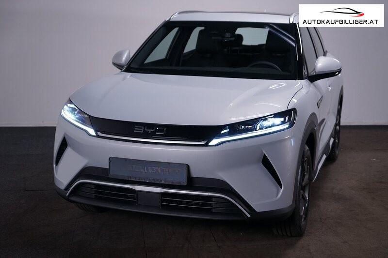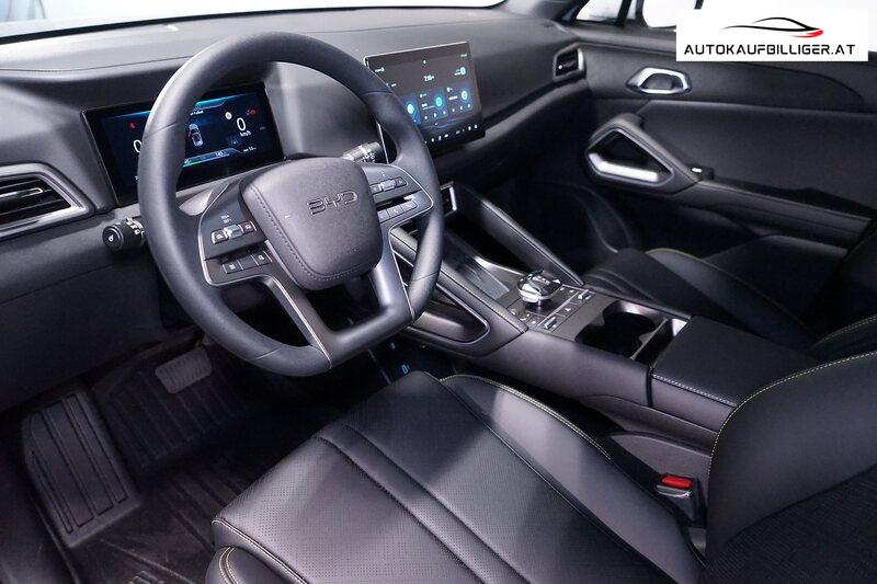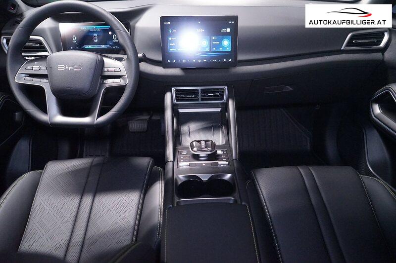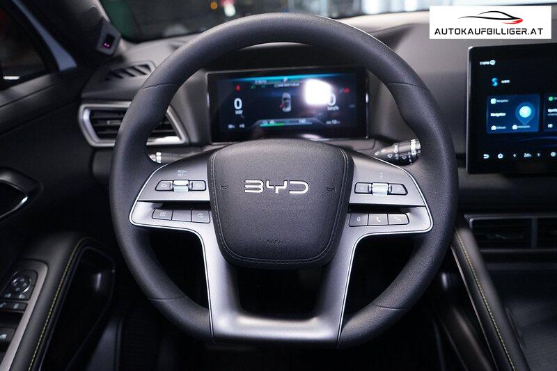 Ausstattung:Exterieur:Metallic-LackierungLED Scheinwerfer,Tagfahrlicht und HeckleuchtenFollow Me Home-Funktion (Scheinwerfer schalten sich frühzeitig ein/leuchten nach)Intelligenter Fernlicht-Assistent (IHBC)Panorama Sonnendach mit elektrisch verstellbarer DachsonnenblendeDachreling aus Aluminium 17 Zoll Aluminiumfelgen Beheizte und manuell einklappbare Außenspiegel RegensensorInterieur:MultifunktionslenkradSitze aus veganem LederFahrersitz mit 6-Wege-SitzverstellungBeifahrersitz mit 4-Wege-SitzverstellungGeteilt klappbare Rücksitze - 40:60LED Leselicht vorne & hintenSonnenblende mit beleuchtetem KosmetikspiegelFahrerseite mit One Touch-Fensterheber und EinklemmschutzInfotainment:8.8-Zoll TFT LCD InformationsdisplayElektrisch drehbarer Touchscreen (10.1 Zoll)DAB & FM RadioAudiosystem mit 6 LautsprechernNavigationssystem „Hi, BYD!“ SprachsteuerungInternet der Fahrzeuge (4G)4 Cloud Service3 USB Ladeanschlüsse (1x 60 W Typ C vorne / 1 x 18 W Typ A, 1 x 18 W Typ C hinten)Android AutoTM & Apple CarPlay Sicherheit & FahrassistenzFahrer- und BeifahrerairbagSeitenairbag vorneDach-/SchulterairbagsSicherheitsgurt mit Gurtstraffer und Kraftbegrenzer2x ISOFIX in den äußeren RücksitzenReifendruck-Kontrollsystem (TPMS)Kindersicherung (mechanisch)NotrufsystemRadar-Parksensoren hintenRückfahrkameraFahrer-Müdigkeitserkennung (DMS)Abstandsregeltempomat (ACC) & Intelligent Cruise Control (ICC)Intelligente Tempobegrenzer (ISLC)Spurhalteassistent (LDA)Notfall-Spurhalteassistent (ELKA)Toter Winkel-Assistent (BSD)Türöffnungswarnung (DOW)Verkehrszeichenerkennung (TSR)Automatische Notbremsung (AEB)Integrated Power Brake (IPB)Antiblockiersystem (ABS)Elektrische Parkbremse (EPB)Elektronischer Bremskraftverteiler (EBD)Antriebsschlupfregelung (TCS)Comfort Stop (CST)Bergabfahrhilfe (HDC)Auto-Hold-Funktion (AVH)Elektronisches Stabilitätsprogramm (ESP)Front Collision Warning (FCW)Rear Collision Warning (RCW)Rear Cross-Traffic Alert System (RCTA) hinten, Rear Cross-Traffic Brake (RCTB) hintenKomfort & EffizienzVehicle-To-Load-Funktion (V2L)4 Fahrmodi (Normal, Sport, Eco, Schnee)2x e-Schlüssel & 1x NFC SchlüsselKeyless Entry & Keyless StartWärmepumpe11 kW On-Board-ChargerPM2,5 Luftfilter