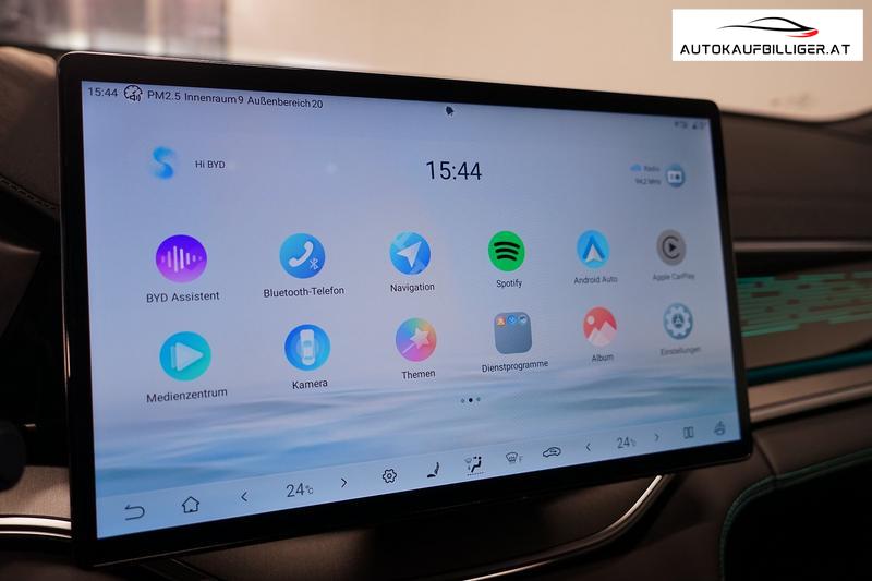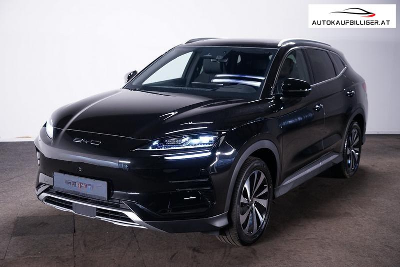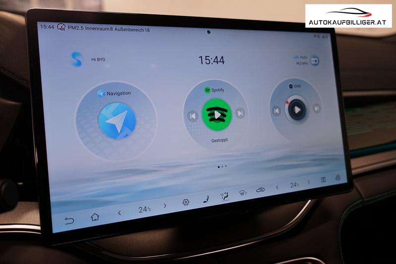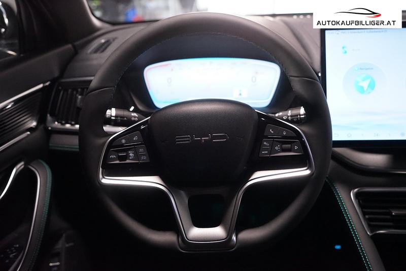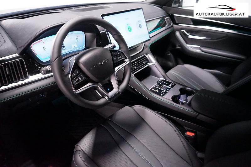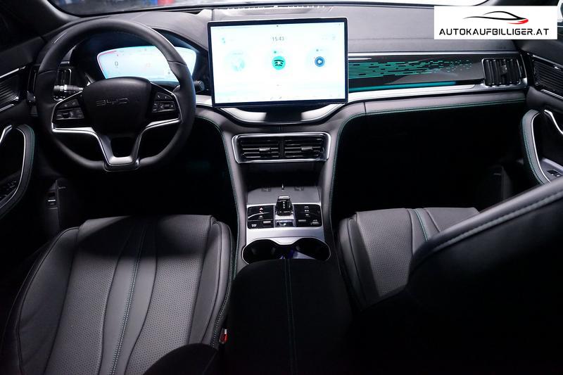 Innenraum:Multifunktionslenkrad, veganes LederLenkrad, beheiztSitze mit veganem LederbezugFahrersitz mit elektrischer 8-Wegeverstellung, PositionsspeicherFahrersitz belüftet, beheizt, speicherbare EinstellungFahrersitz mit integrierter KopfstützeBeifahrersitz mit elektrischer 4-WegeverstellungBeifahrersitz belüftet, beheiztBeifahrersitz mit integrierter KopfstützeRücksitze, manuell einstellbare KopfstützeGeteilte, umklappbare Rücksitze, 40:60Ambientebeleuchtung, mehrfarbig, rhythmusgesteuertZwei-Zonen-KlimatisierungGepäckraumleuchteVordersitz-FußraumleuchtenLED-VordertürleuchtenLED-Leseleuchten vornLED-Leseleuchten hinten4 x One-Touch-Fensterheber mit EinklemmschutzfunktionVordersitz-Sonnenblenden mit beleuchtetem SchminkspiegelRückspiegel mit AbblendautomatikBelüftungsdüsen hintenHutablage12V-SteckdoseMittelarmlehne vorn, 2 BecherhalterArmlehne hinten, 2 BecherhalterPM2.5-LuftfilterPM2.5-LuftreinigungssystemKommunikation & Multimedia:12,3-Zoll Voll-TFT LCD-Display15,6-Zoll-Touchscreen, elektrisch schwenkbarDAB+ & FMInfinity®-Soundsystem mit 10 LautsprechernHead-up-Display (HUD) Intelligente "Hi, BYD"-Sprachsteuerung4G-Konnektivität an BordCloud-Dienst - BYD-AppUSB-Anschlüsse vorn, 1 x 18 W Typ C, 1 x 60 W Typ C USB-Anschlüsse hinten, 2 x 18 W Typ C Drahtlos-Telefonladedock, 2 x 15 W Android Auto™ & Apple CarPlaySicherheit:FahrerairbagBeifahrerairbag, DeaktivierungsschalterMittlerer FrontairbagSeitenairbags vorneDach-/SchulterairbagsVordersitz-Sicherheitsgurte mit Gurtstraffer/-kraftbegrenzerRücksitz-Sicherheitsgurte mit GurtstrafferMittlerer Rücksitz-Sicherheitsgurt mit GurtkraftbegrenzerISOFIX und i-Size ‒ Beifahrersitz und AußenrücksitzeReifendruck-Überwachungssystem (TPMS)Kindererkennung (CPD)DiebstahlschutzsystemVerriegelungsautomatikMechanische KindersicherungeCall-NotruffunktionFahrassistenten:Radar-Parksensoren vorn und hinten360°-KameraAbstandsregeltempomat (ACC) & Intelligenter Tempomat (ICC)Spurhalteassistent (LKA)Totwinkel-Assistent (BSD)Fahrermüdigkeitserkennung (DFM)Antriebsschlupfregelung (TCS)Spurwechselassistent (LCA)Elektronische Bremskraftverteilung (EBD)Intelligenter Tempobegrenzer (ISLC)Ausparkhilfe vorne (FCTA) und Ausparkbremse vorne (FCTB)Ausparkhilfe hinten (RCTA) und Ausparkbremse hinten (RCTB)Notfall-Spurhalteassistent (ELKA)Kollisionsvorwarnfunktion (PCW)Frontalkollisionswarnsystem (FCW)Heckkollisionswarnsystem (RCW)Spurwarnfunktion (LDW) Türwarnfunktion (DOW)Spurhalteassistent (LDA)Elektrische Feststellbremse (EPB)Comfort Stop (CST) (Bremskomfortanpassung)Spurhalteassistent (LDP)Bergabfahrhilfe (HDC)BremshalteautomatikNotbremsautomatik (AEB)Verkehrszeichenerkennung (TSR)Hydraulischer Bremsassistent (HBA)Hydraulischer Bremskraftverstärker (HBB)Kontrollierte Verzögerung mit Feststellbremse (CDP)Fahrdynamikregelung (VDC)Berganfahrhilfe (HHC)Überschlag-Schutzsystem (RMI)Bremsenübersteuerung (BOS)