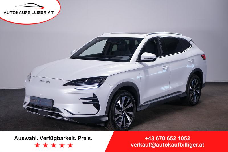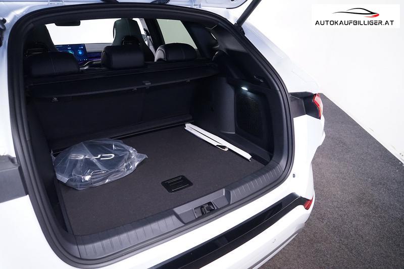 Innenraum:Multifunktionslenkrad, veganes LederLenkrad, beheiztSitze mit veganem LederbezugFahrersitz mit elektrischer 8-Wegeverstellung, PositionsspeicherFahrersitz belüftet, beheizt, speicherbare EinstellungFahrersitz mit integrierter KopfstützeBeifahrersitz mit elektrischer 4-WegeverstellungBeifahrersitz belüftet, beheiztBeifahrersitz mit integrierter KopfstützeRücksitze, manuell einstellbare KopfstützeGeteilte, umklappbare Rücksitze, 40:60Ambientebeleuchtung, mehrfarbig, rhythmusgesteuertZwei-Zonen-KlimatisierungGepäckraumleuchteVordersitz-FußraumleuchtenLED-VordertürleuchtenLED-Leseleuchten vornLED-Leseleuchten hinten4 x One-Touch-Fensterheber mit EinklemmschutzfunktionVordersitz-Sonnenblenden mit beleuchtetem SchminkspiegelRückspiegel mit AbblendautomatikBelüftungsdüsen hintenHutablage12V-SteckdoseMittelarmlehne vorn, 2 BecherhalterArmlehne hinten, 2 BecherhalterPM2.5-LuftfilterPM2.5-LuftreinigungssystemKommunikation & Multimedia:12,3-Zoll Voll-TFT LCD-Display15,6-Zoll-Touchscreen, elektrisch schwenkbarDAB+ & FMInfinity®-Soundsystem mit 10 LautsprechernHead-up-Display (HUD) Intelligente "Hi, BYD"-Sprachsteuerung4G-Konnektivität an BordCloud-Dienst - BYD-AppUSB-Anschlüsse vorn, 1 x 18 W Typ C, 1 x 60 W Typ C USB-Anschlüsse hinten, 2 x 18 W Typ C Drahtlos-Telefonladedock, 2 x 15 W Android Auto™ & Apple CarPlaySicherheit:FahrerairbagBeifahrerairbag, DeaktivierungsschalterMittlerer FrontairbagSeitenairbags vorneDach-/SchulterairbagsVordersitz-Sicherheitsgurte mit Gurtstraffer/-kraftbegrenzerRücksitz-Sicherheitsgurte mit GurtstrafferMittlerer Rücksitz-Sicherheitsgurt mit GurtkraftbegrenzerISOFIX und i-Size ‒ Beifahrersitz und AußenrücksitzeReifendruck-Überwachungssystem (TPMS)Kindererkennung (CPD)DiebstahlschutzsystemVerriegelungsautomatikMechanische KindersicherungeCall-NotruffunktionFahrassistenten:Radar-Parksensoren vorn und hinten360°-KameraAbstandsregeltempomat (ACC) & Intelligenter Tempomat (ICC)Spurhalteassistent (LKA)Totwinkel-Assistent (BSD)Fahrermüdigkeitserkennung (DFM)Antriebsschlupfregelung (TCS)Spurwechselassistent (LCA)Elektronische Bremskraftverteilung (EBD)Intelligenter Tempobegrenzer (ISLC)Ausparkhilfe vorne (FCTA) und Ausparkbremse vorne (FCTB)Ausparkhilfe hinten (RCTA) und Ausparkbremse hinten (RCTB)Notfall-Spurhalteassistent (ELKA)Kollisionsvorwarnfunktion (PCW)Frontalkollisionswarnsystem (FCW)Heckkollisionswarnsystem (RCW)Spurwarnfunktion (LDW) Türwarnfunktion (DOW)Spurhalteassistent (LDA)Elektrische Feststellbremse (EPB)Comfort Stop (CST) (Bremskomfortanpassung)Spurhalteassistent (LDP)Bergabfahrhilfe (HDC)BremshalteautomatikNotbremsautomatik (AEB)Verkehrszeichenerkennung (TSR)Hydraulischer Bremsassistent (HBA)Hydraulischer Bremskraftverstärker (HBB)Kontrollierte Verzögerung mit Feststellbremse (CDP)Fahrdynamikregelung (VDC)Berganfahrhilfe (HHC)Überschlag-Schutzsystem (RMI)Bremsenübersteuerung (BOS)