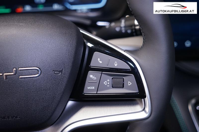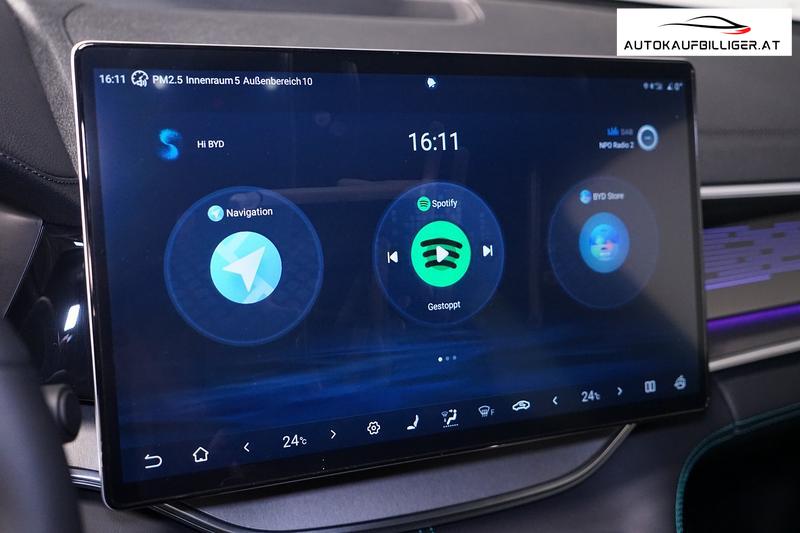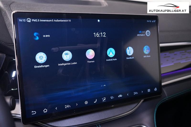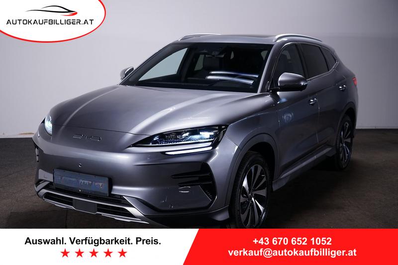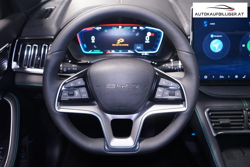 Innenraum:Multifunktionslenkrad, veganes LederLenkrad, beheiztSitze mit veganem LederbezugFahrersitz mit elektrischer 8-Wegeverstellung, PositionsspeicherFahrersitz belüftet, beheizt, speicherbare EinstellungFahrersitz mit integrierter KopfstützeBeifahrersitz mit elektrischer 4-WegeverstellungBeifahrersitz belüftet, beheiztBeifahrersitz mit integrierter KopfstützeRücksitze, manuell einstellbare KopfstützeGeteilte, umklappbare Rücksitze, 40:60Ambientebeleuchtung, mehrfarbig, rhythmusgesteuertZwei-Zonen-KlimatisierungGepäckraumleuchteVordersitz-FußraumleuchtenLED-VordertürleuchtenLED-Leseleuchten vornLED-Leseleuchten hinten4 x One-Touch-Fensterheber mit EinklemmschutzfunktionVordersitz-Sonnenblenden mit beleuchtetem SchminkspiegelRückspiegel mit AbblendautomatikBelüftungsdüsen hintenHutablage12V-SteckdoseMittelarmlehne vorn, 2 BecherhalterArmlehne hinten, 2 BecherhalterPM2.5-LuftfilterPM2.5-LuftreinigungssystemKommunikation & Multimedia:12,3-Zoll Voll-TFT LCD-Display15,6-Zoll-Touchscreen, elektrisch schwenkbarDAB+ & FMInfinity®-Soundsystem mit 10 LautsprechernHead-up-Display (HUD) Intelligente "Hi, BYD"-Sprachsteuerung4G-Konnektivität an BordCloud-Dienst - BYD-AppUSB-Anschlüsse vorn, 1 x 18 W Typ C, 1 x 60 W Typ C USB-Anschlüsse hinten, 2 x 18 W Typ C Drahtlos-Telefonladedock, 2 x 15 W Android Auto™ & Apple CarPlaySicherheit:FahrerairbagBeifahrerairbag, DeaktivierungsschalterMittlerer FrontairbagSeitenairbags vorneDach-/SchulterairbagsVordersitz-Sicherheitsgurte mit Gurtstraffer/-kraftbegrenzerRücksitz-Sicherheitsgurte mit GurtstrafferMittlerer Rücksitz-Sicherheitsgurt mit GurtkraftbegrenzerISOFIX und i-Size ‒ Beifahrersitz und AußenrücksitzeReifendruck-Überwachungssystem (TPMS)Kindererkennung (CPD)DiebstahlschutzsystemVerriegelungsautomatikMechanische KindersicherungeCall-NotruffunktionFahrassistenten:Radar-Parksensoren vorn und hinten360°-KameraAbstandsregeltempomat (ACC) & Intelligenter Tempomat (ICC)Spurhalteassistent (LKA)Totwinkel-Assistent (BSD)Fahrermüdigkeitserkennung (DFM)Antriebsschlupfregelung (TCS)Spurwechselassistent (LCA)Elektronische Bremskraftverteilung (EBD)Intelligenter Tempobegrenzer (ISLC)Ausparkhilfe vorne (FCTA) und Ausparkbremse vorne (FCTB)Ausparkhilfe hinten (RCTA) und Ausparkbremse hinten (RCTB)Notfall-Spurhalteassistent (ELKA)Kollisionsvorwarnfunktion (PCW)Frontalkollisionswarnsystem (FCW)Heckkollisionswarnsystem (RCW)Spurwarnfunktion (LDW) Türwarnfunktion (DOW)Spurhalteassistent (LDA)Elektrische Feststellbremse (EPB)Comfort Stop (CST) (Bremskomfortanpassung)Spurhalteassistent (LDP)Bergabfahrhilfe (HDC)BremshalteautomatikNotbremsautomatik (AEB)Verkehrszeichenerkennung (TSR)Hydraulischer Bremsassistent (HBA)Hydraulischer Bremskraftverstärker (HBB)Kontrollierte Verzögerung mit Feststellbremse (CDP)Fahrdynamikregelung (VDC)Berganfahrhilfe (HHC)Überschlag-Schutzsystem (RMI)Bremsenübersteuerung (BOS)